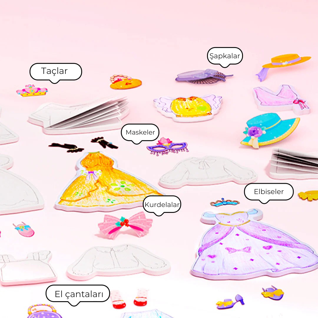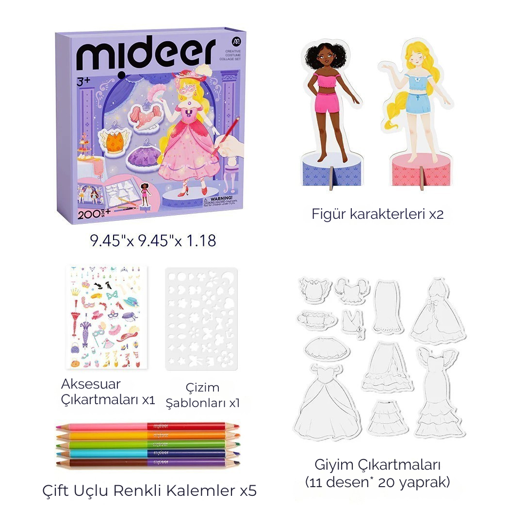 ✔Dahil olanlar: 20 yaprak giysi çıkartması, 1 yaprak aksesuar çıkartması, 4 figür karakteri, 1 çizim şablonu, 5 çift uçlu renkli kalem